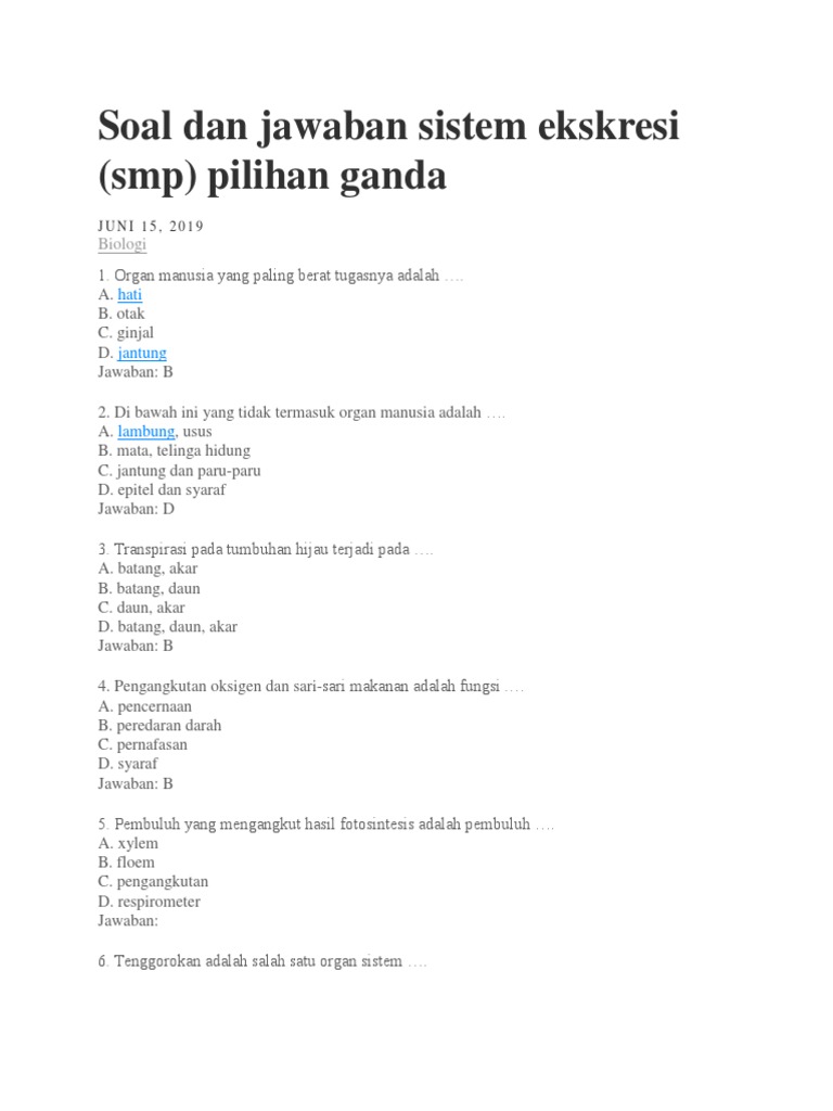 Biologi kelas 8 contoh soal pembahasan soal pertanyaan sistem ekskresi pada manusia soal dan jawaban soal ipa kelas 8 soal pilihan ganda soal sistem ekskresi pada manusia Jati Harmoko Semua orang hidup terikat dan bergantung pada pengetahuan atau. BERILAH TANDA SILANG X PADA HURUF A B C ATAU D PADA JAWABAN YANG BENAR. Tentunya hal ini sangat penting sekali untuk anda pelajari.